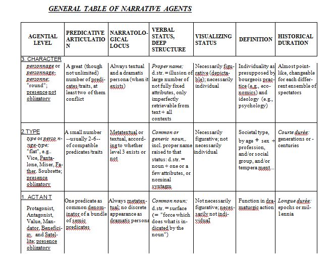 At this point it would be possible to inventorize at length a number of contributions to a clear definition and delimitation of what I take to be this third, intermediate level indispensable for agential analysis. I shall content myself with acknowledging that for all my disagreement with their ideological horizons I have used hints from the names mentioned so far, as well as from Doutrepont, Todorov, and Ubersfeld, (8) in order to construct the following table which I present as my basic hypothesis, and which I can here defend only through its analytical yield. It should be strongly stressed that the three levels of analysis, numbered in my table from the deepest level upward, are cumulative and not alternative. The two basic ones, actants and types, are to be found in every narrative text; the uppermost one, characters in Forster’s “round” sense, may or may not be present in any given text (that depends on its epistemic epoch and genre). This might already point to the key position of the intermediate level.