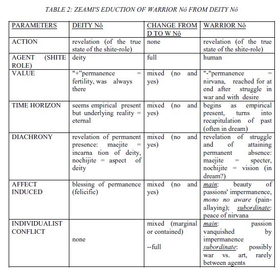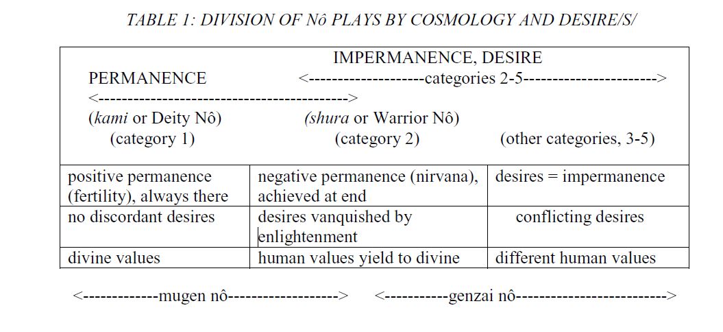 1.2. I shall begin by presenting an initial argument in the form of a table of parameters which, starting from the dominant categorization into five groups, proceeds to doubt it by means of the division into genzai and mugen nô and proposes to refine this in favour of a trisection. Leaving other matters aside, I shall then advance to focus on the first two categories–the Deity and Warrior plays–which are obviously, prima facie correctly distinguished sets, more or less monolithic because mainly created for the same purposes and same audiences by Zeami. I am banking on these clear groupings being apt for an initial theoretical discussion which could lead us to what I take to be the central theoretical problem in a discussion of Nô dramaturgy, and of immense consequence for any theory of dramaturgy and theatre, namely: the puzzle of whether conflict is necessarily present in Nô.